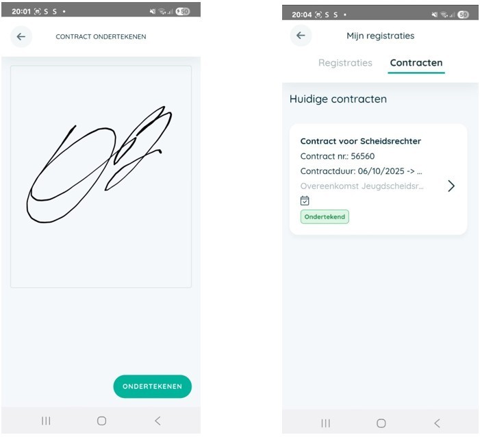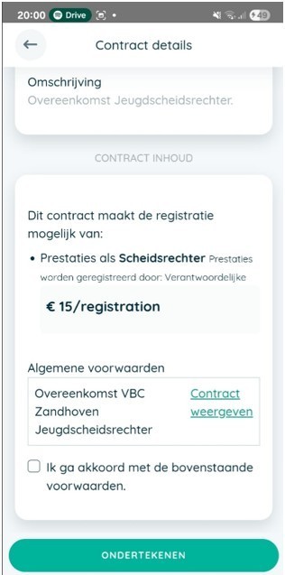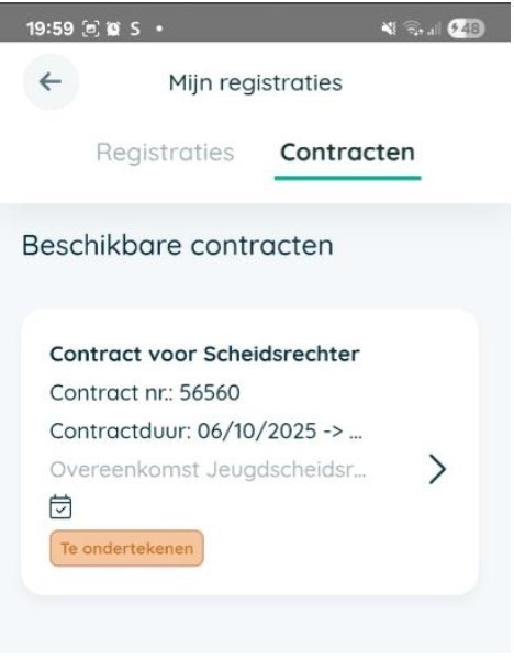 Als je een scheidsrechtertaak in je planning hebt staan, zal Twizzit controleren of je een contract hebt. Ga hiervoor in de app (weer met de 3 streepjes op de smartphone) naar “Registraties”. Druk daar bovenaan op Contracten. Indien je nog geen ondertekend contract hebt zie je bij beschikbare contracten “Te ondertekenen” staan.