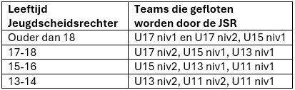 Onderstaande tabel geeft weer wie welke leeftijden bij de jeugd gaat fluiten, dit is een leidraad dus hiervan kan er afgeweken worden.