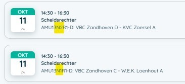 Je kan niet filteren op Niveau 1 of Niveau 2, welk niveau het is zien jullie aan de naam van de wedstrijd. In onderstaand voorbeeld zien we twee U13 matchen op 11 oktober waarvan de taak scheidsrechter nog beschikbaar is. De bovenste wedstrijd is een wedstrijd van Niveau 2, de onderste wedstrijd is een wedstrijd van Niveau 1: